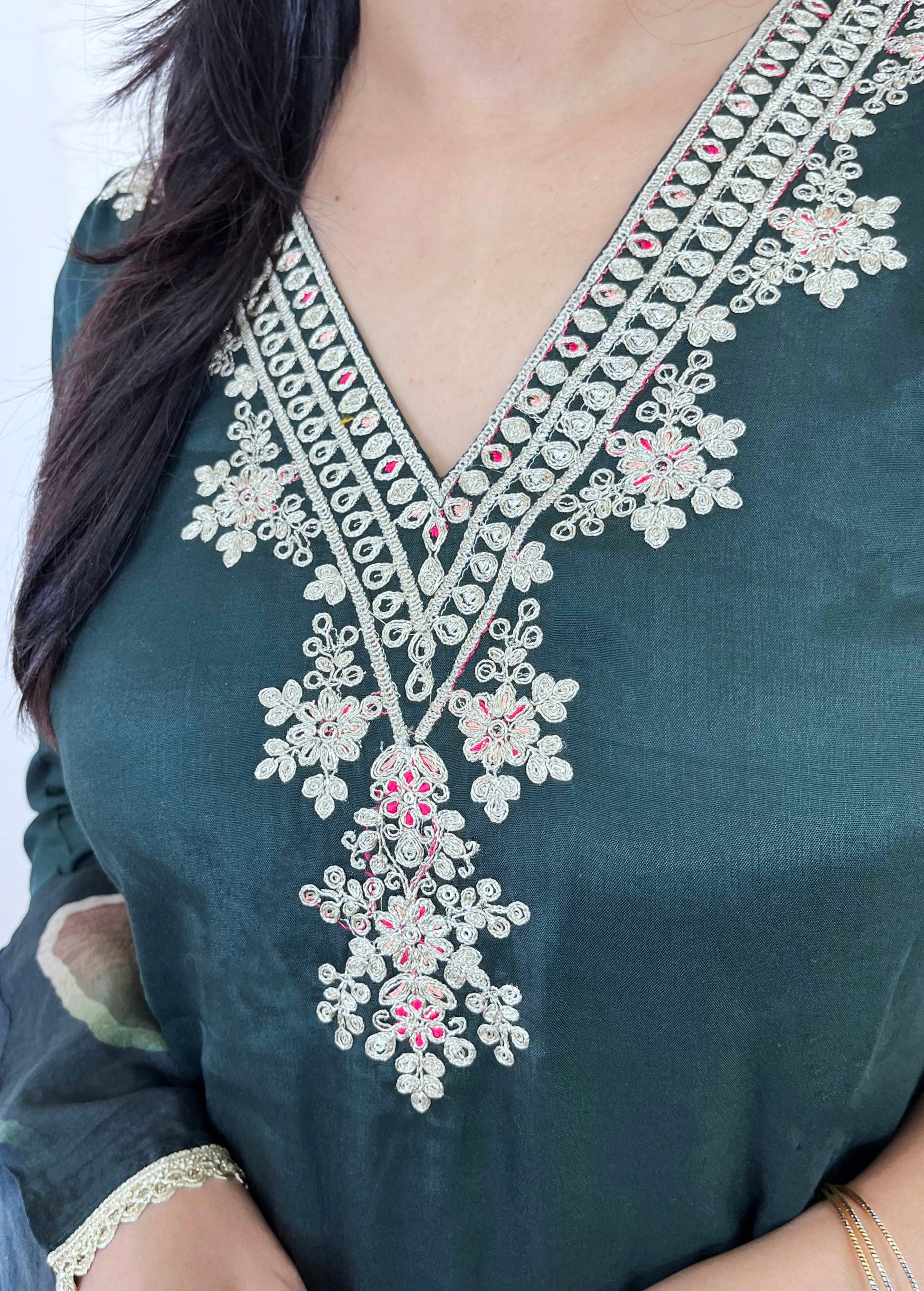 Embrace a blend of traditional charm and contemporary style with our B Green Kurta Suit Set. This elegant ensemble features a beautifully embroidered neckline and a striking printed dupatta, crafted from luxurious materials to ensure both sophistication and comfort.