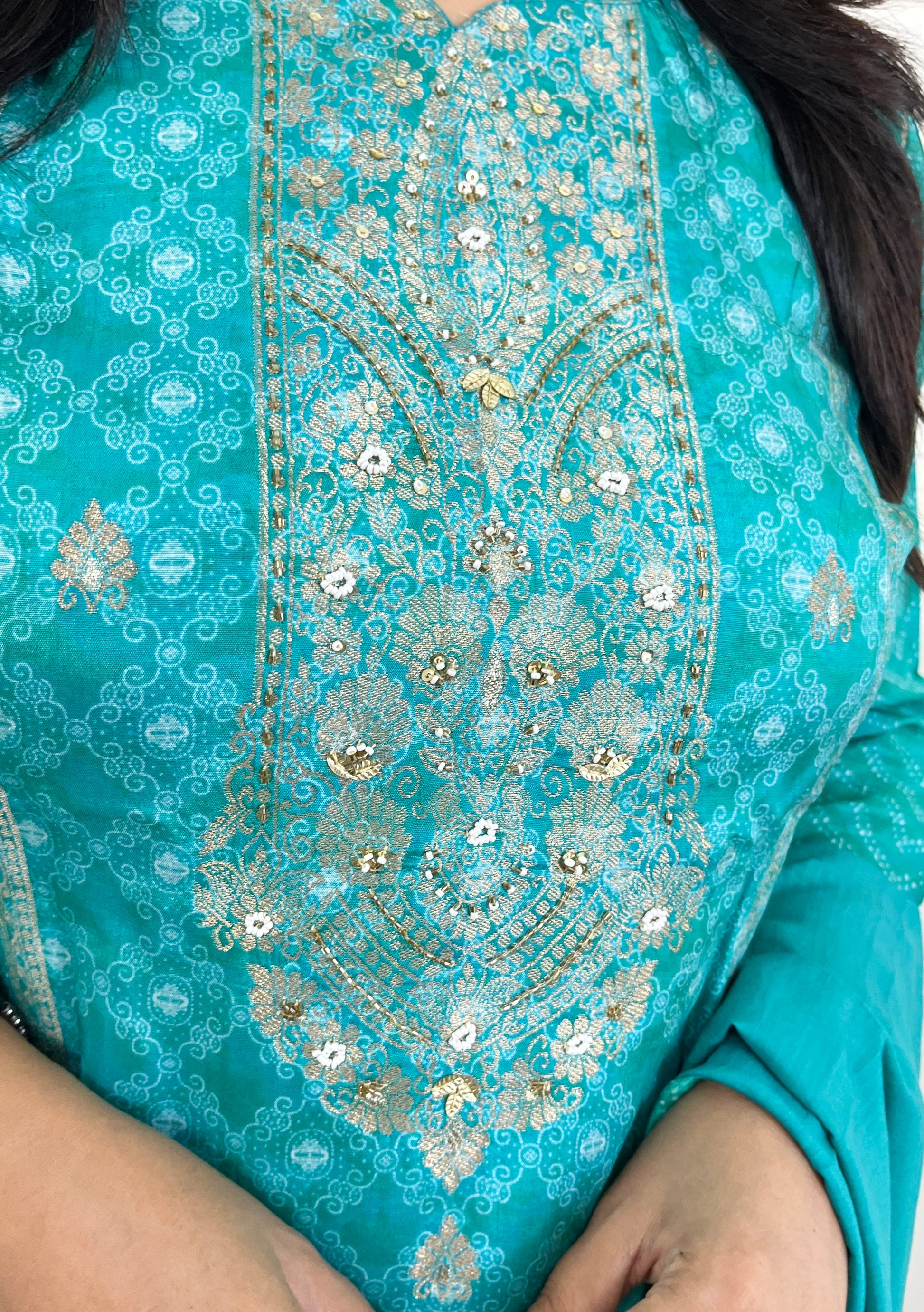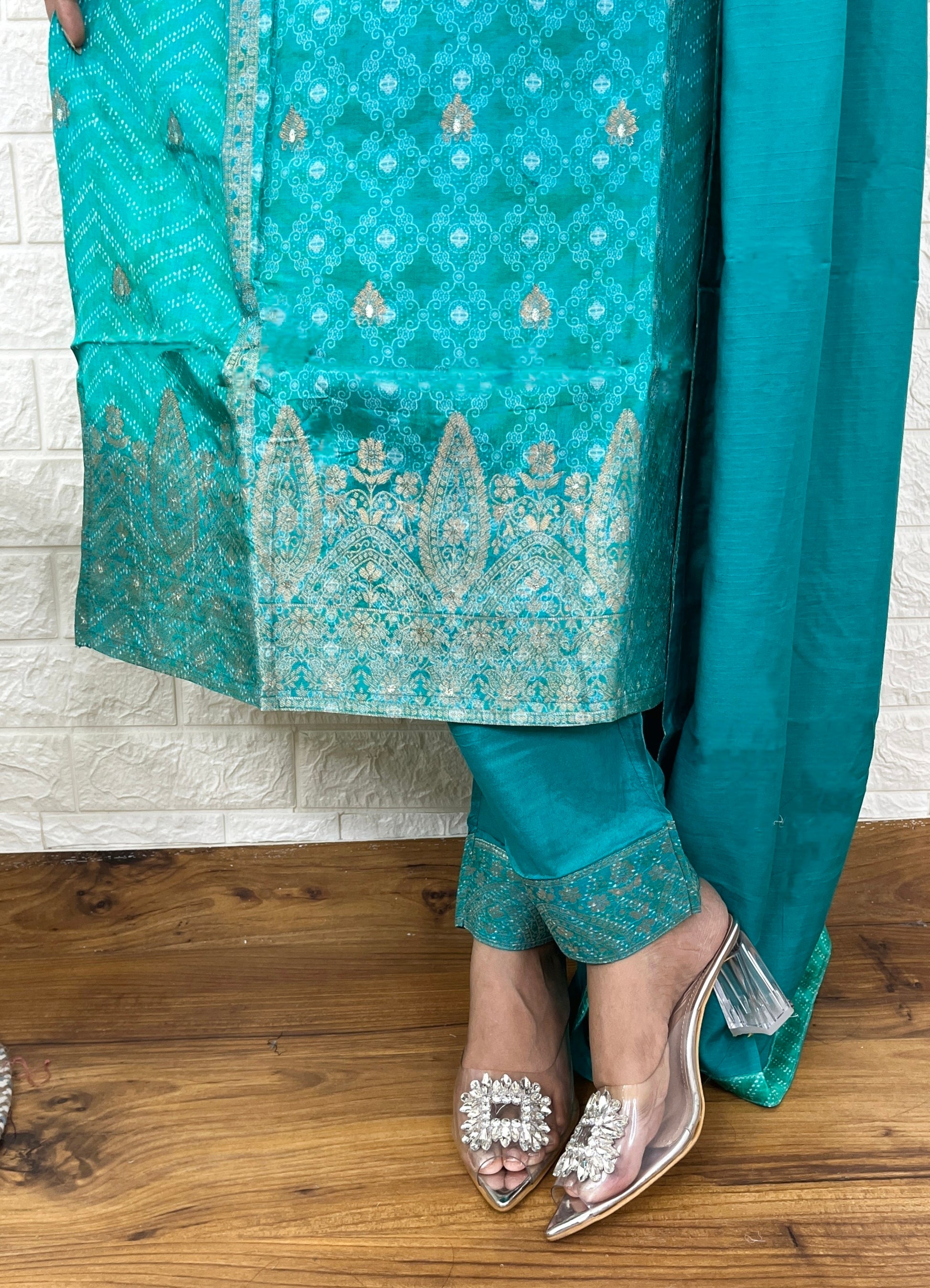 Ideal for weddings, festive occasions, or elegant soirées, the Firozi Banarasi Kurta Suit Set is a timeless addition to your wardrobe. Its vibrant colour and sophisticated style make it a standout choice for any event.