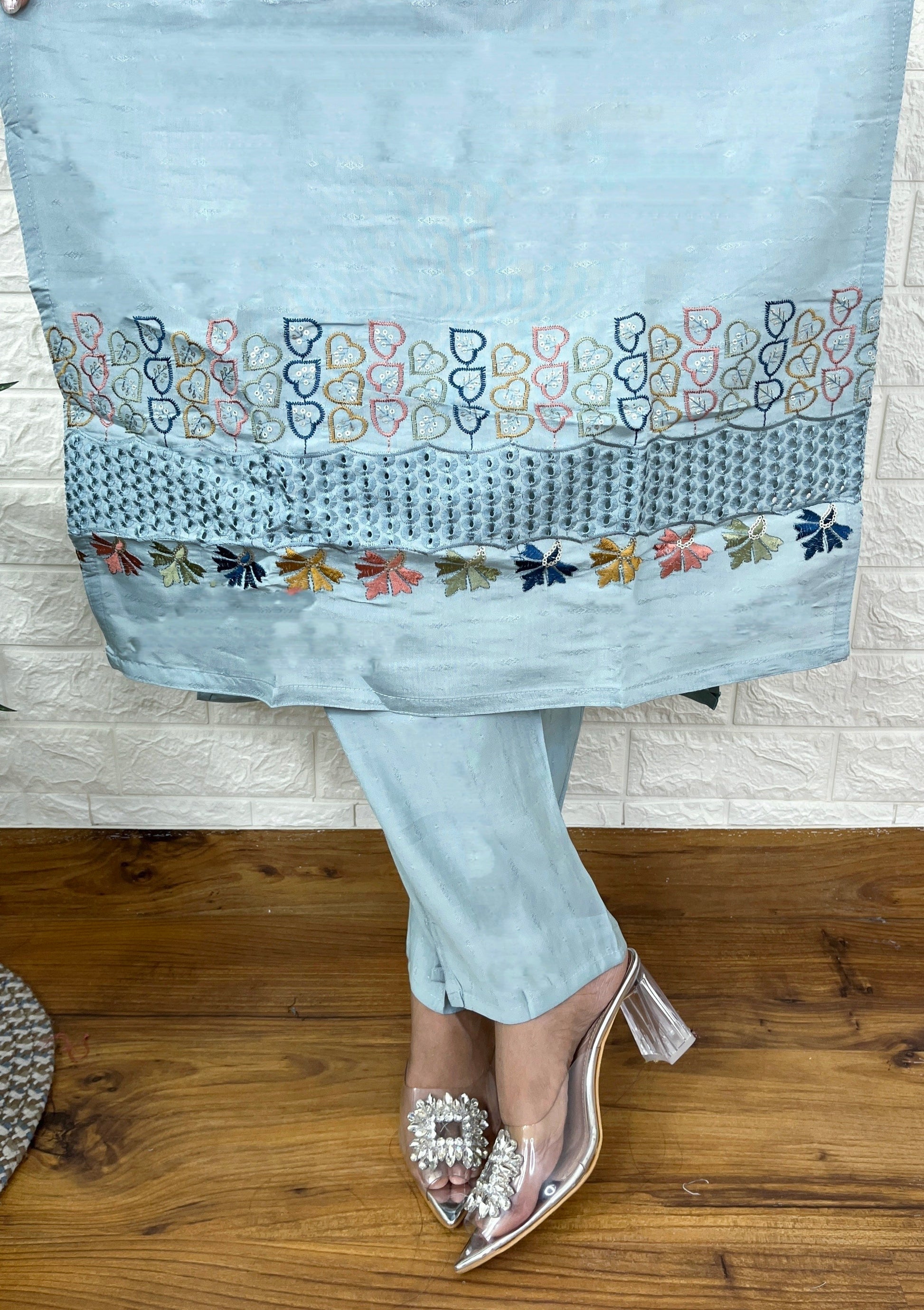 The set includes coordinating bottoms, such as churidars or straight pants, designed to complete the outfit with a seamless look. Made from a comfortable fabric that matches the kurta, the bottoms ensure both style and ease, providing a polished finish to the ensemble.