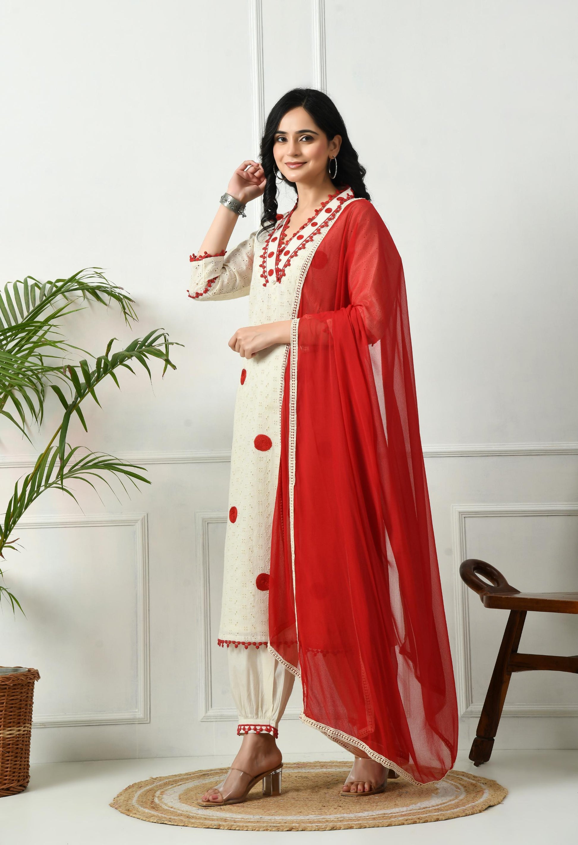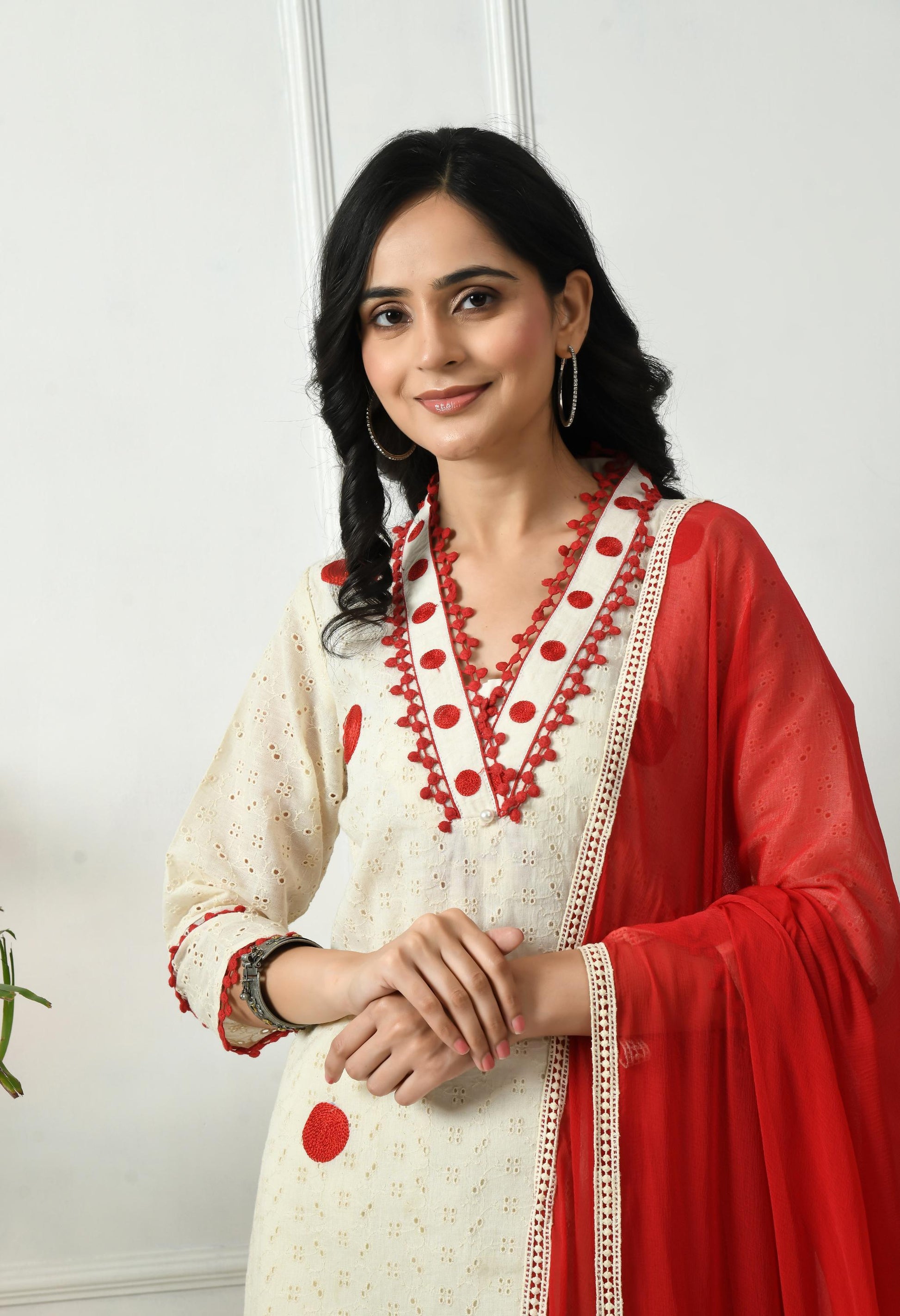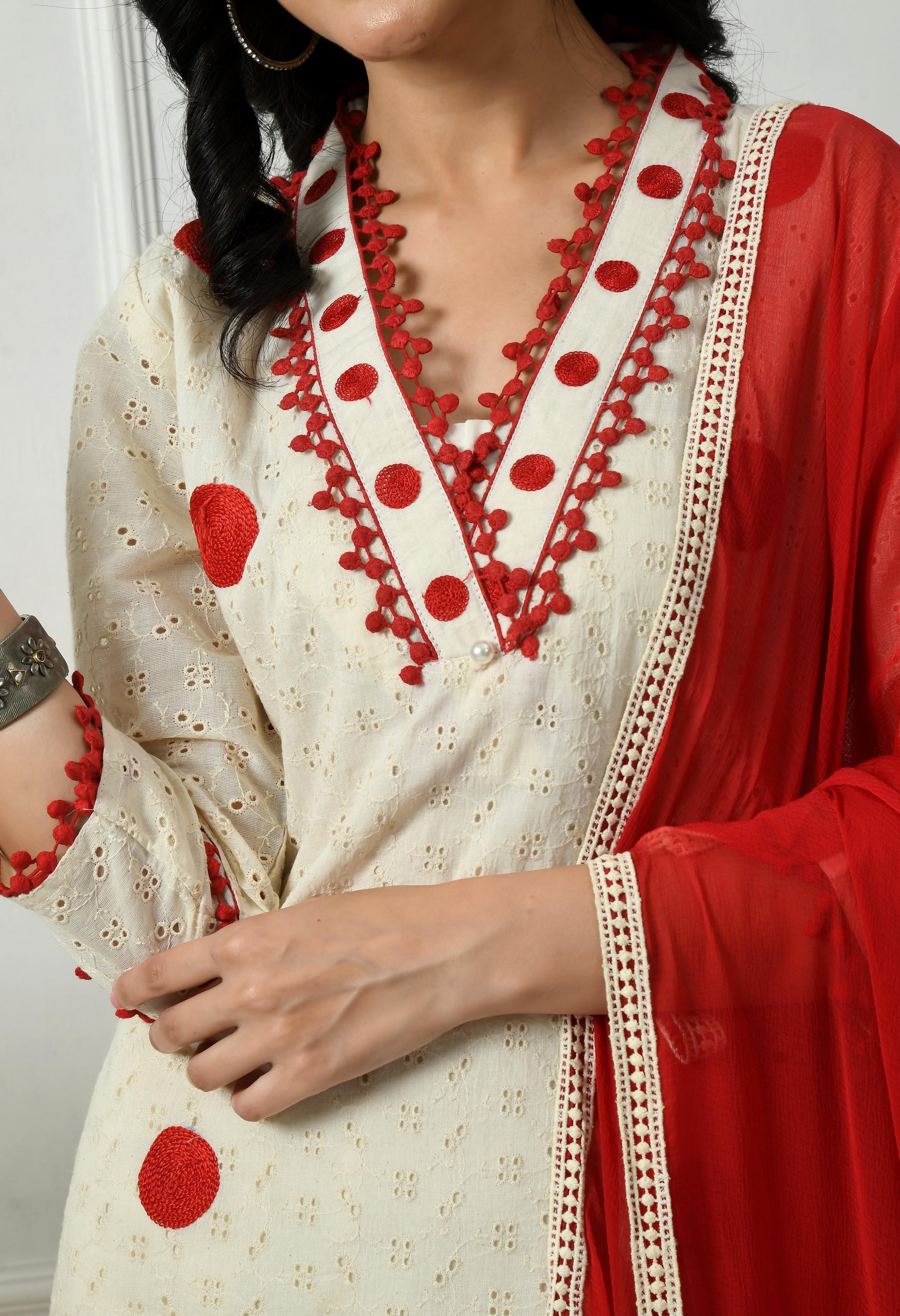 Off White Schiffli Fabric Kurta Set with Red Lace & Chiffon Dupatta