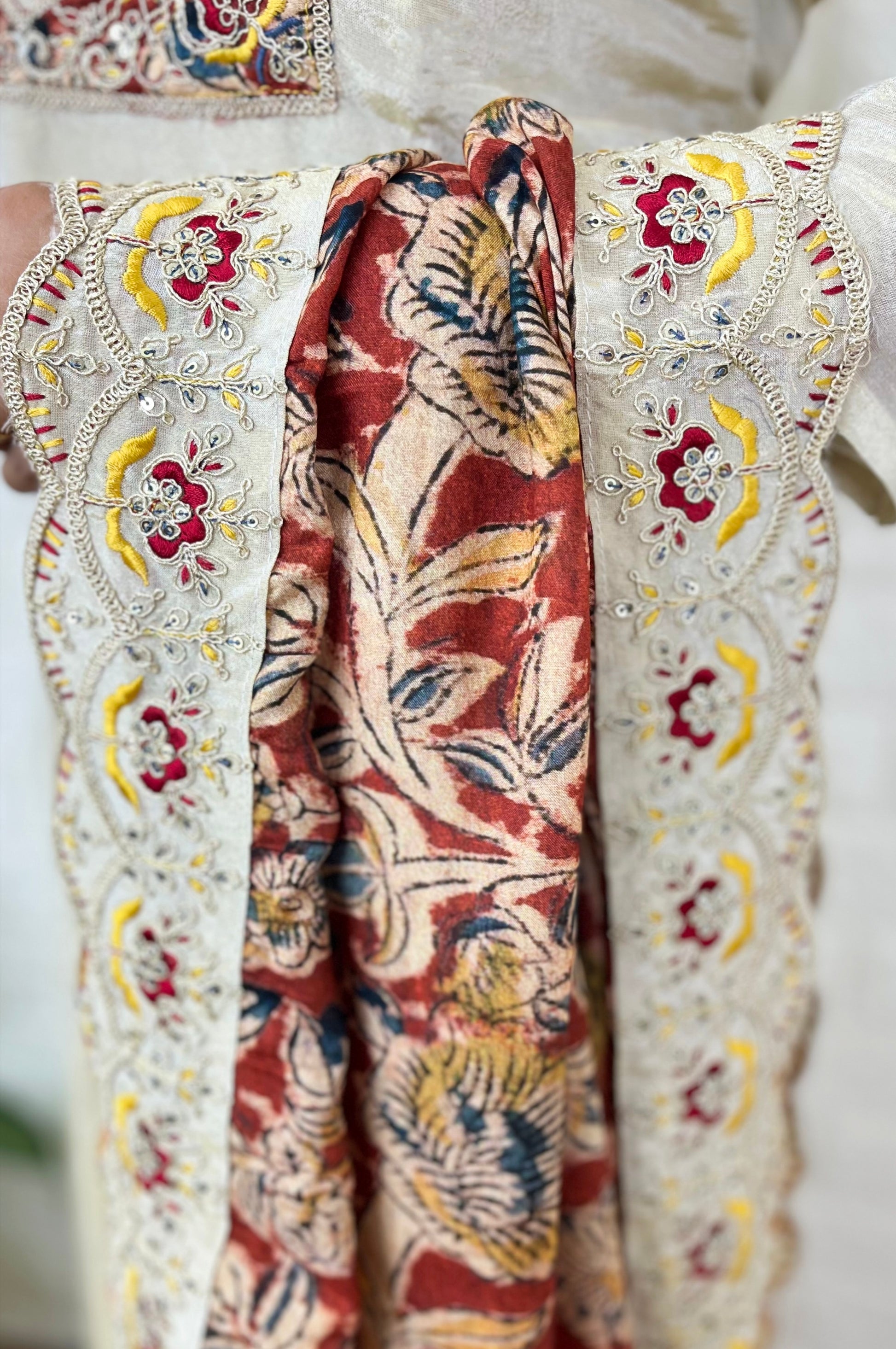 - Fabric: Made from premium, lightweight fabric that drapes gracefully, complementing the kurta's shimmer silk.