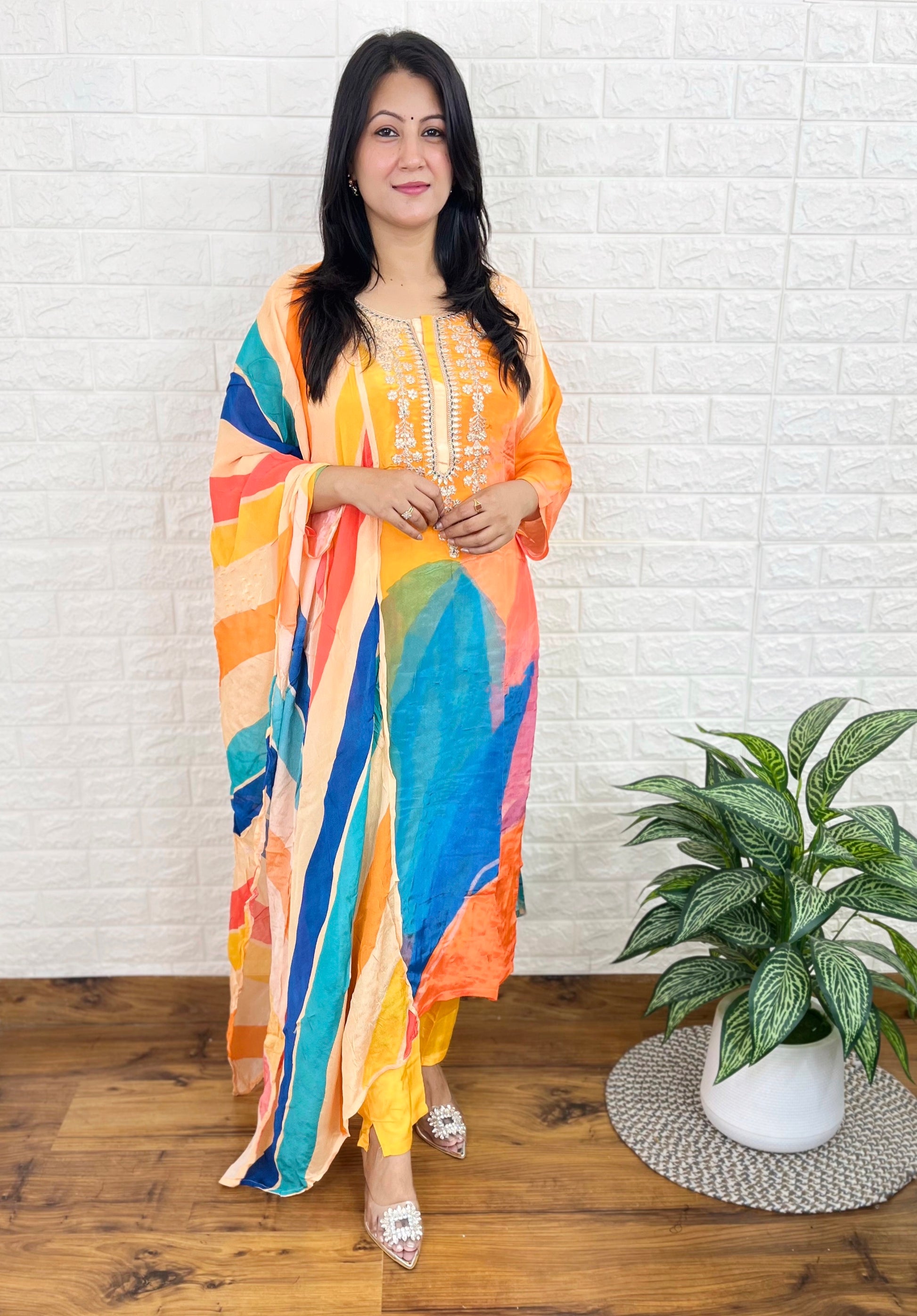 Embrace the vibrancy and charm of this exquisite orange multi-colour suit set, designed to captivate with its bold hues and intricate details. This ensemble effortlessly blends traditional elegance with modern flair, making it perfect for a range of festive occasions, celebrations, or special events. ๐บโจ