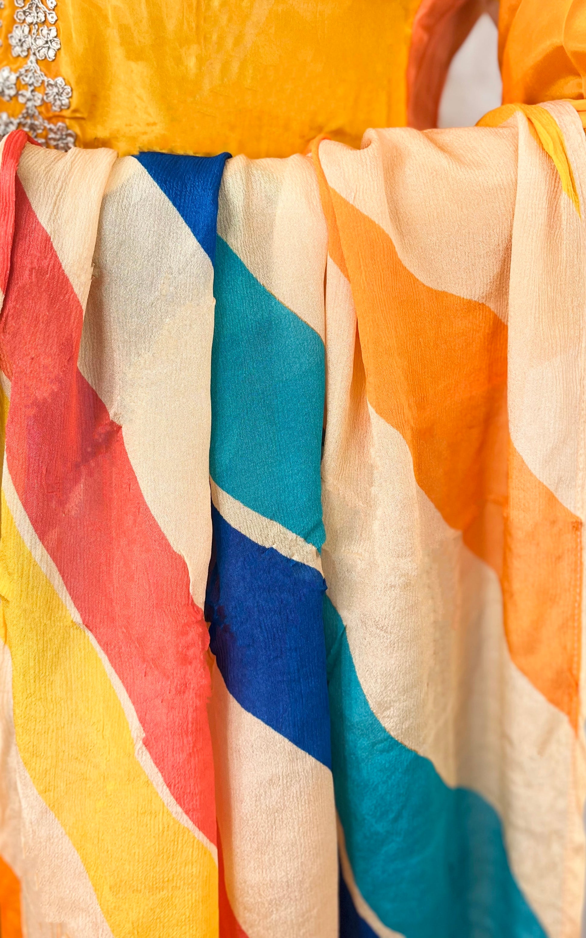 - Design: May feature matching multi-colour details or subtle embellishments that echo the kurtaโs vibrant patterns, ensuring a cohesive look. The dupatta is designed to complement the ensemble without overpowering the kurtaโs striking design.