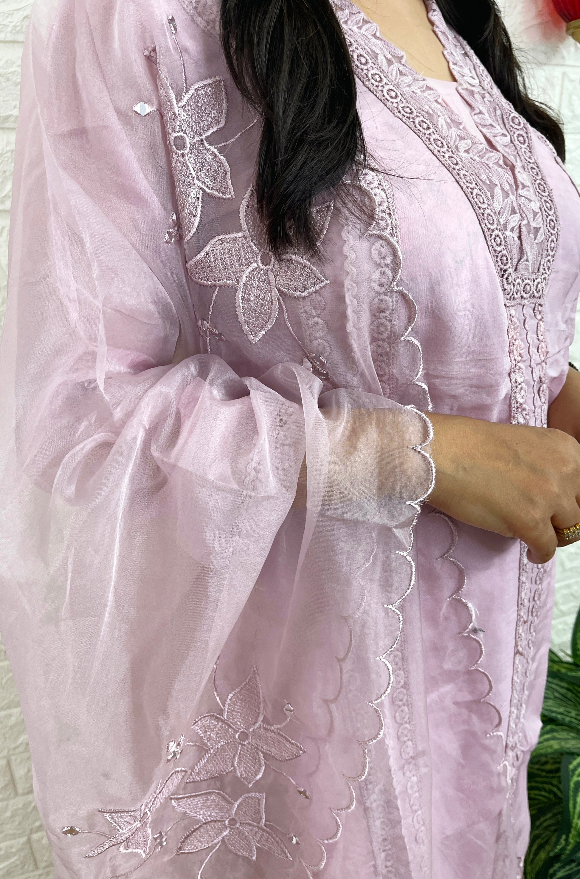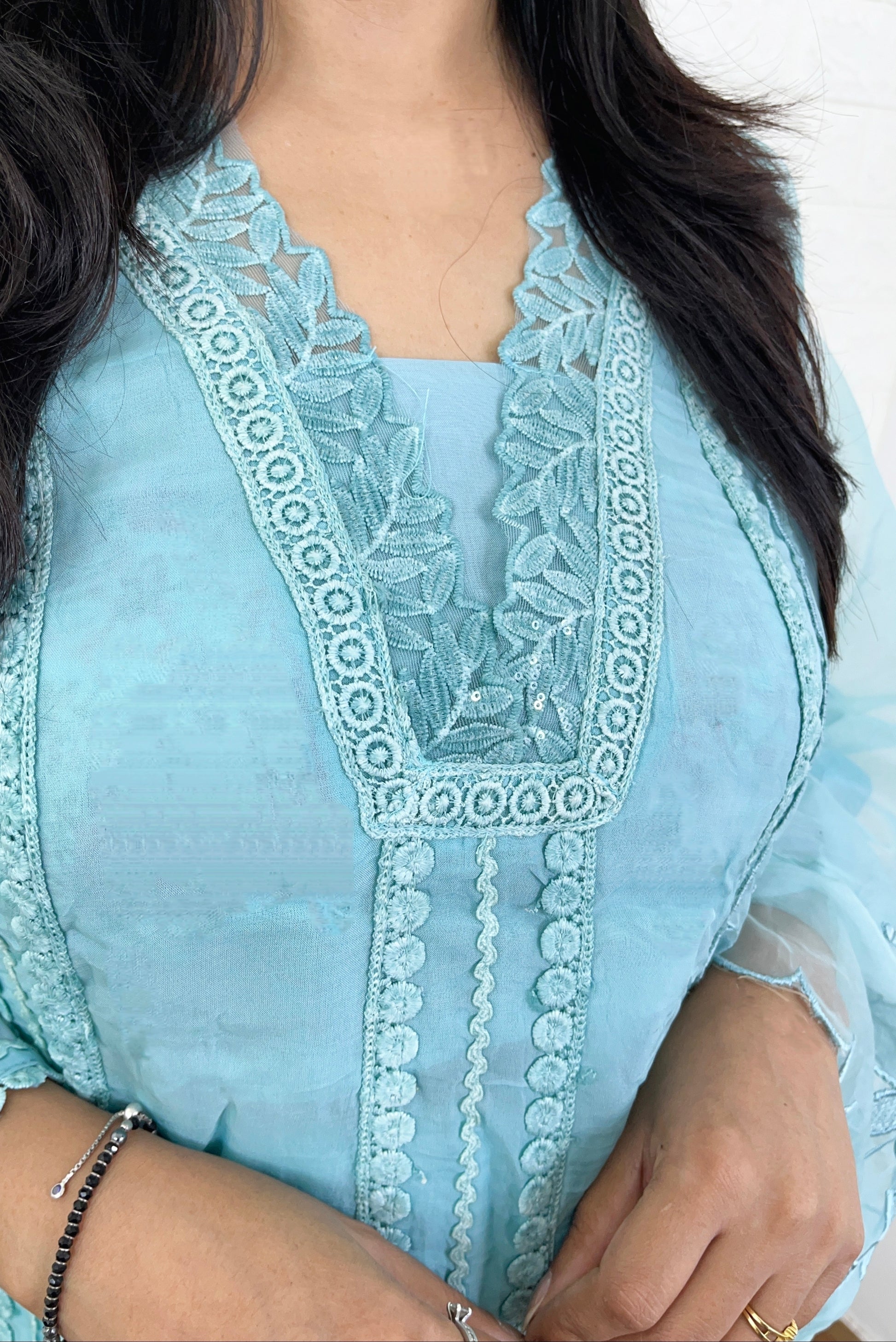 The kurta is adorned with intricate lace work along the neckline, sleeves, and hem, adding delicate artistry to the design. The flattering cut, combined with detailed embroidery, creates a timeless and sophisticated silhouette that’s perfect for any special occasion.