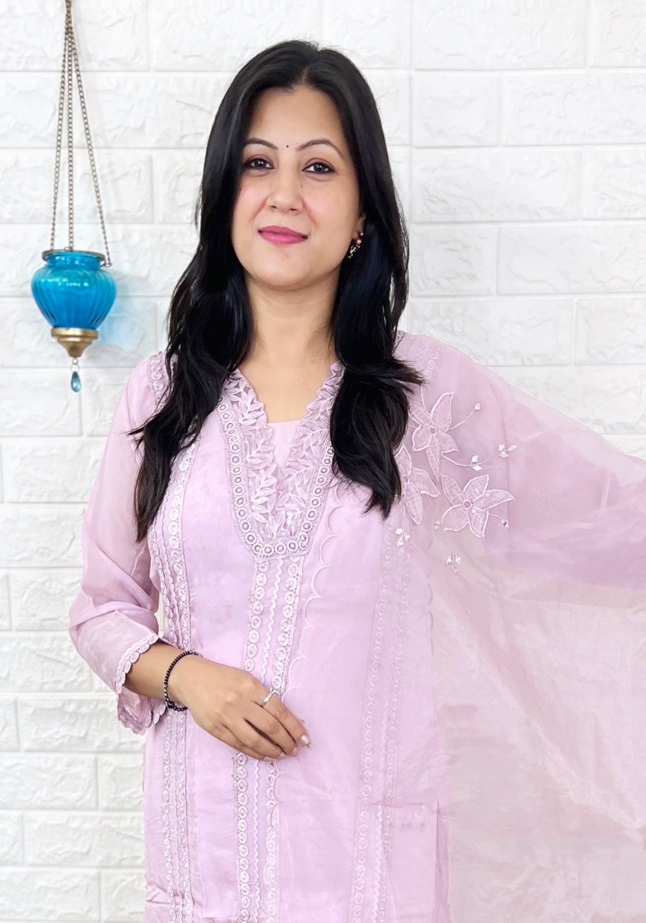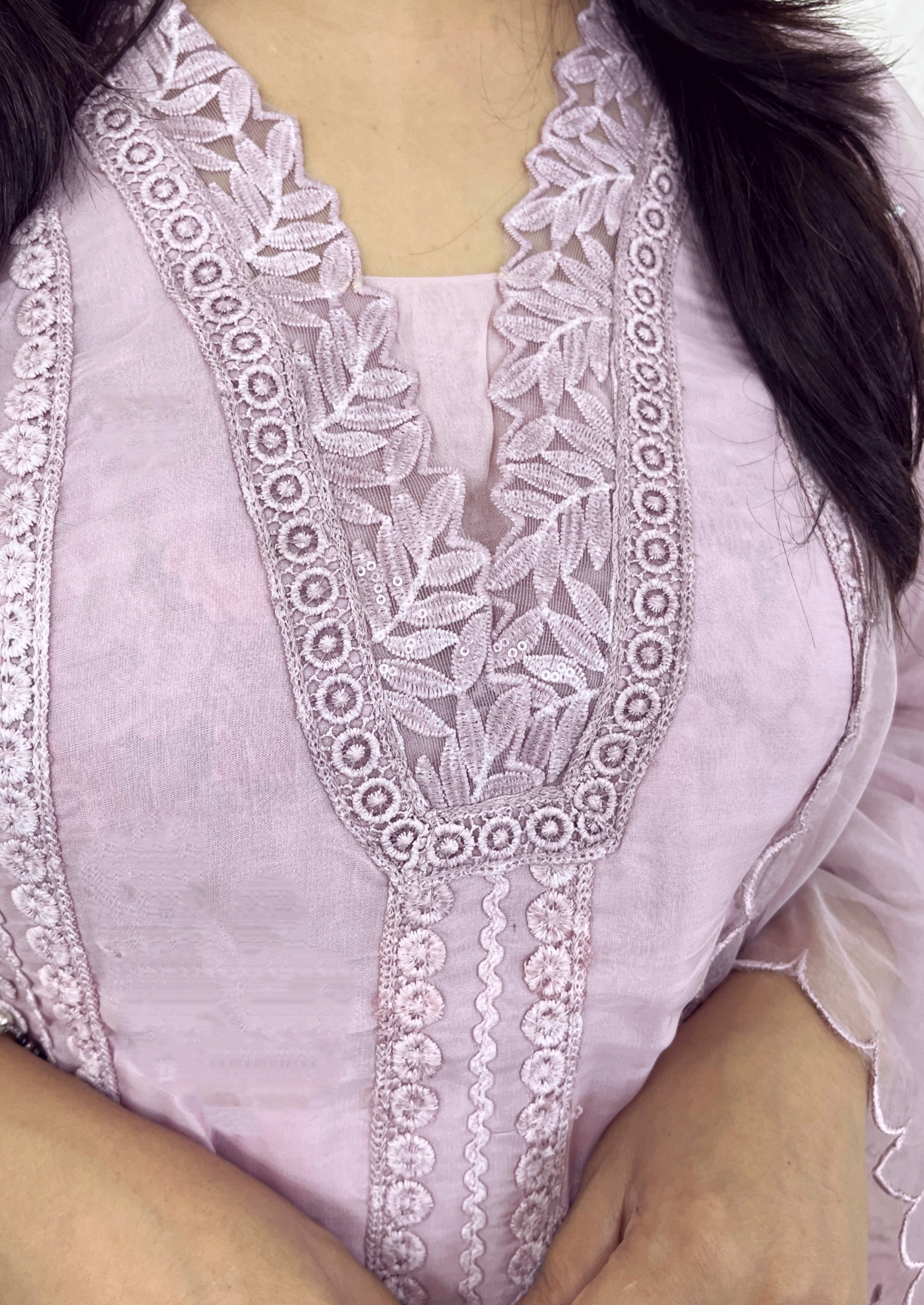 Step into elegance with our Muslin Lace Work Purple Kurta Suit Set, a stunning blend of sophistication and contemporary charm. This exquisite ensemble is designed to make you stand out with grace, making it ideal for special occasions and festive events.