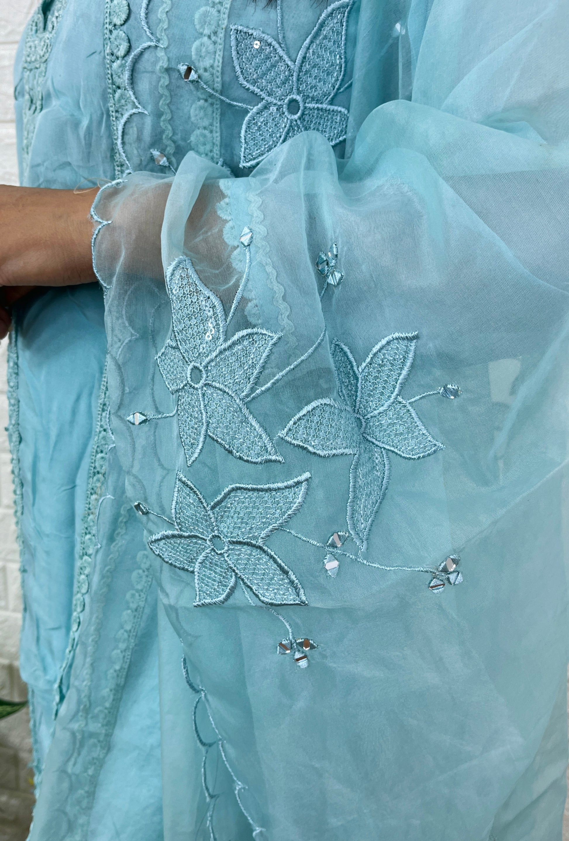 The set includes a coordinating muslin dupatta that mirrors the luxurious texture of the kurta.
