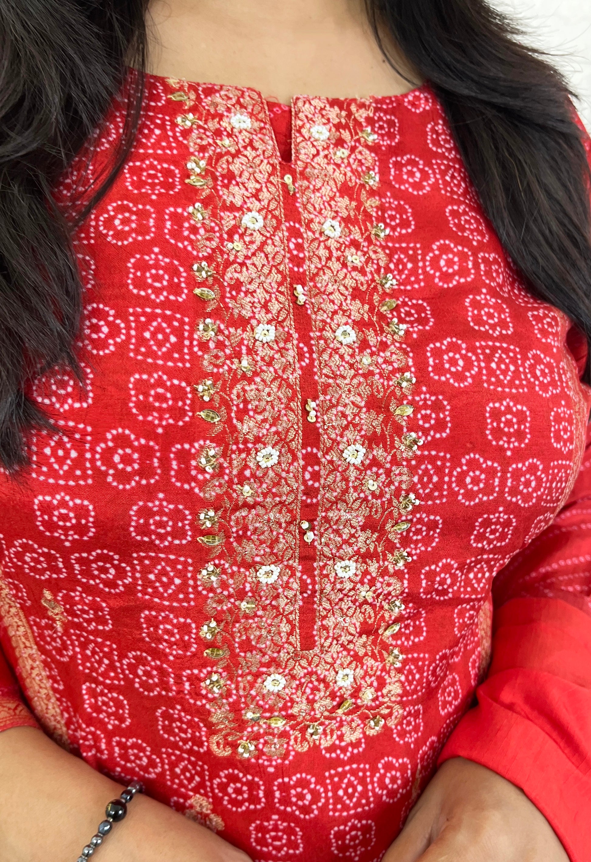 Coordinated red, harmonizing perfectly with the kurta.