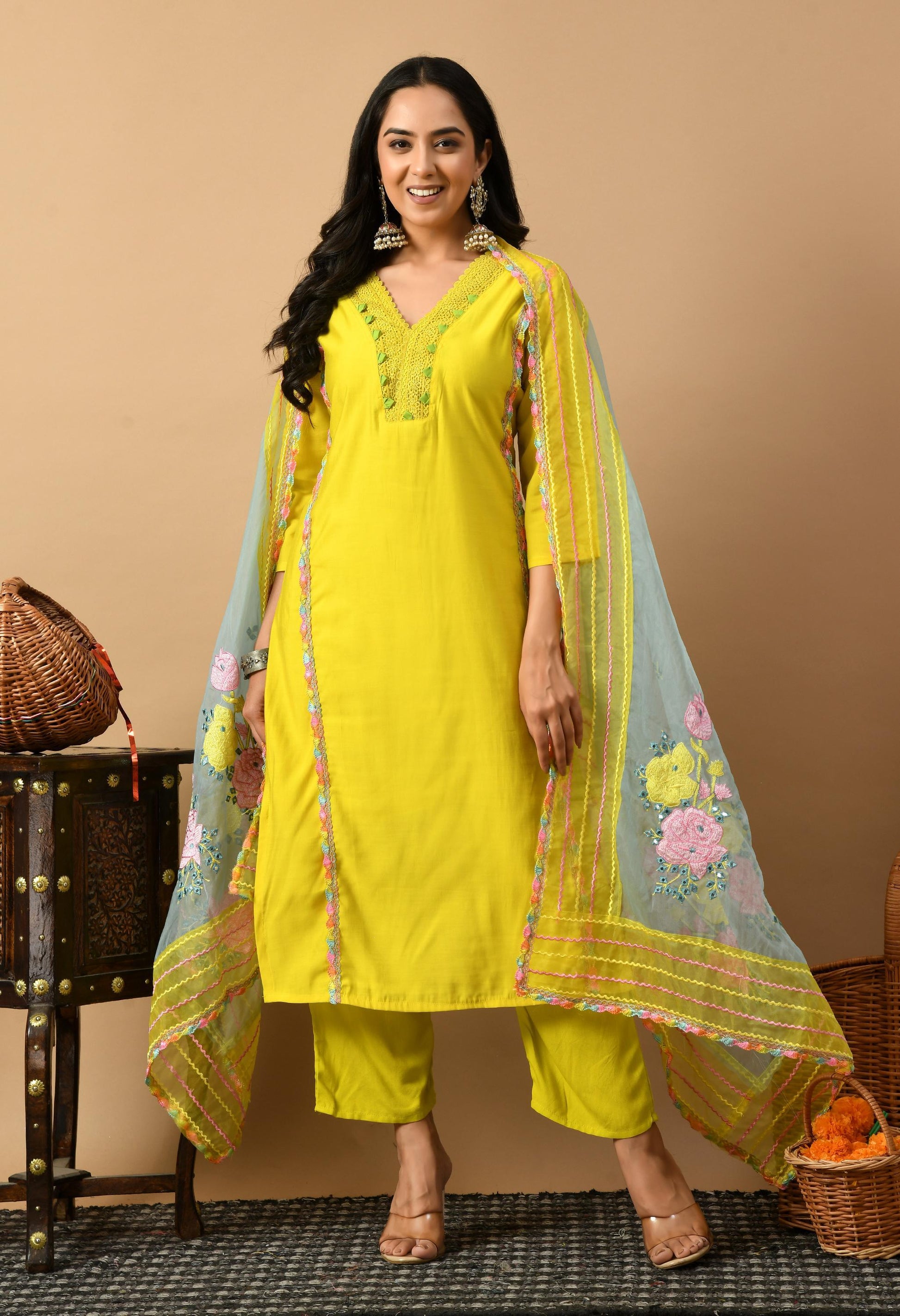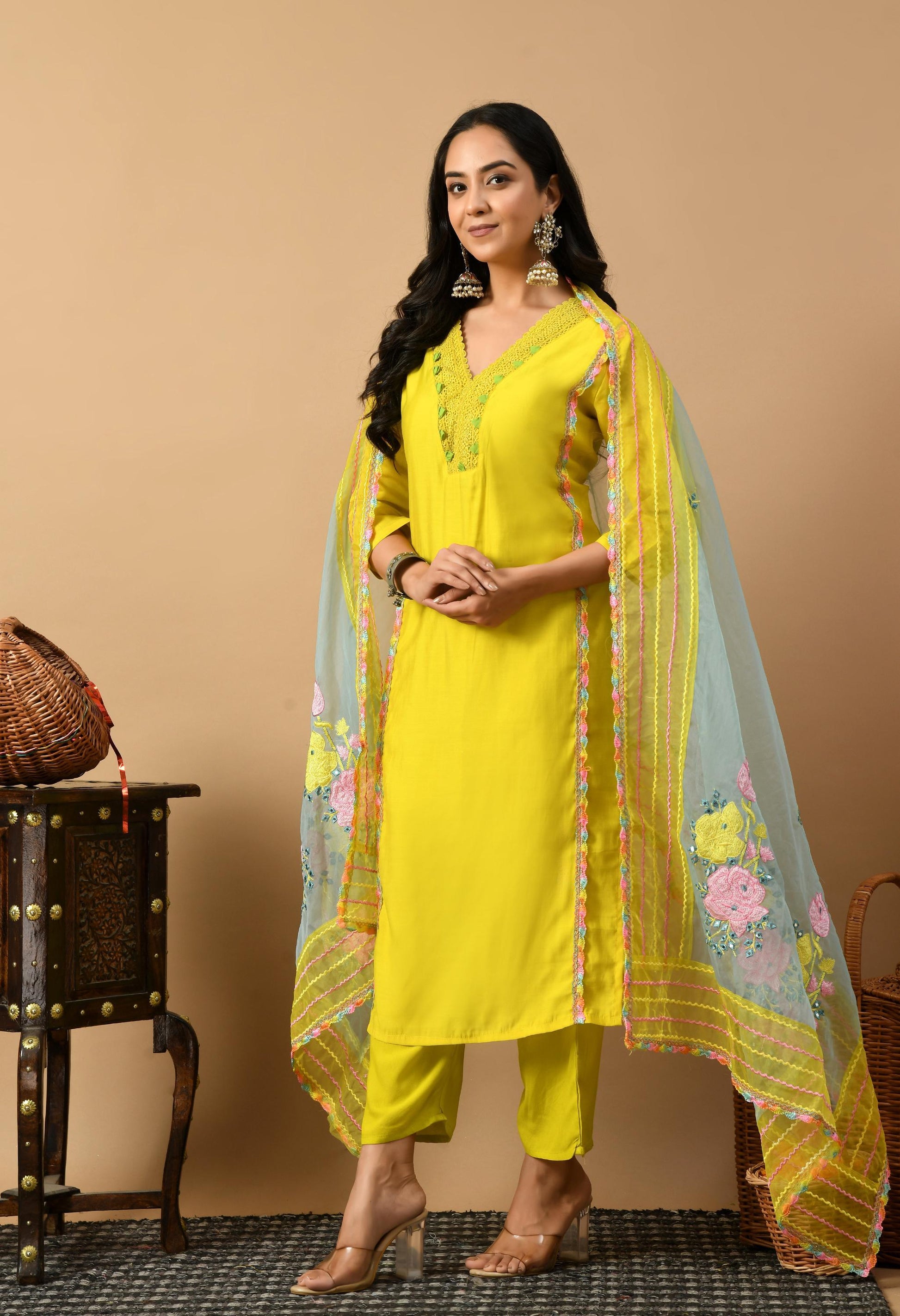 Elevate your style with this stunning ensemble, featuring a vibrant yellow kurta, plain silk pants, and a beautifully embroidered dupatta. Perfect for any special occasion, this set combines traditional elegance with contemporary flair.