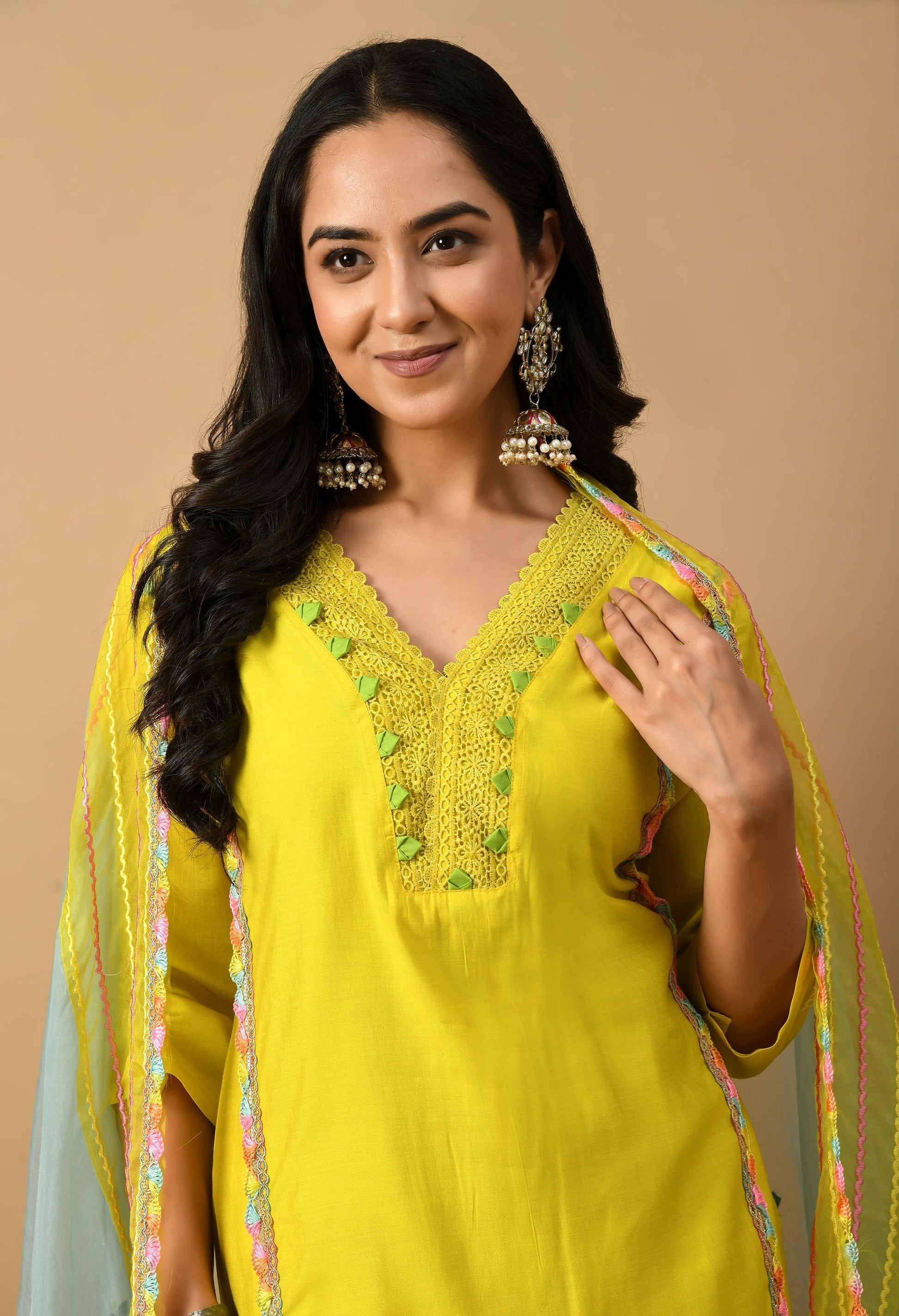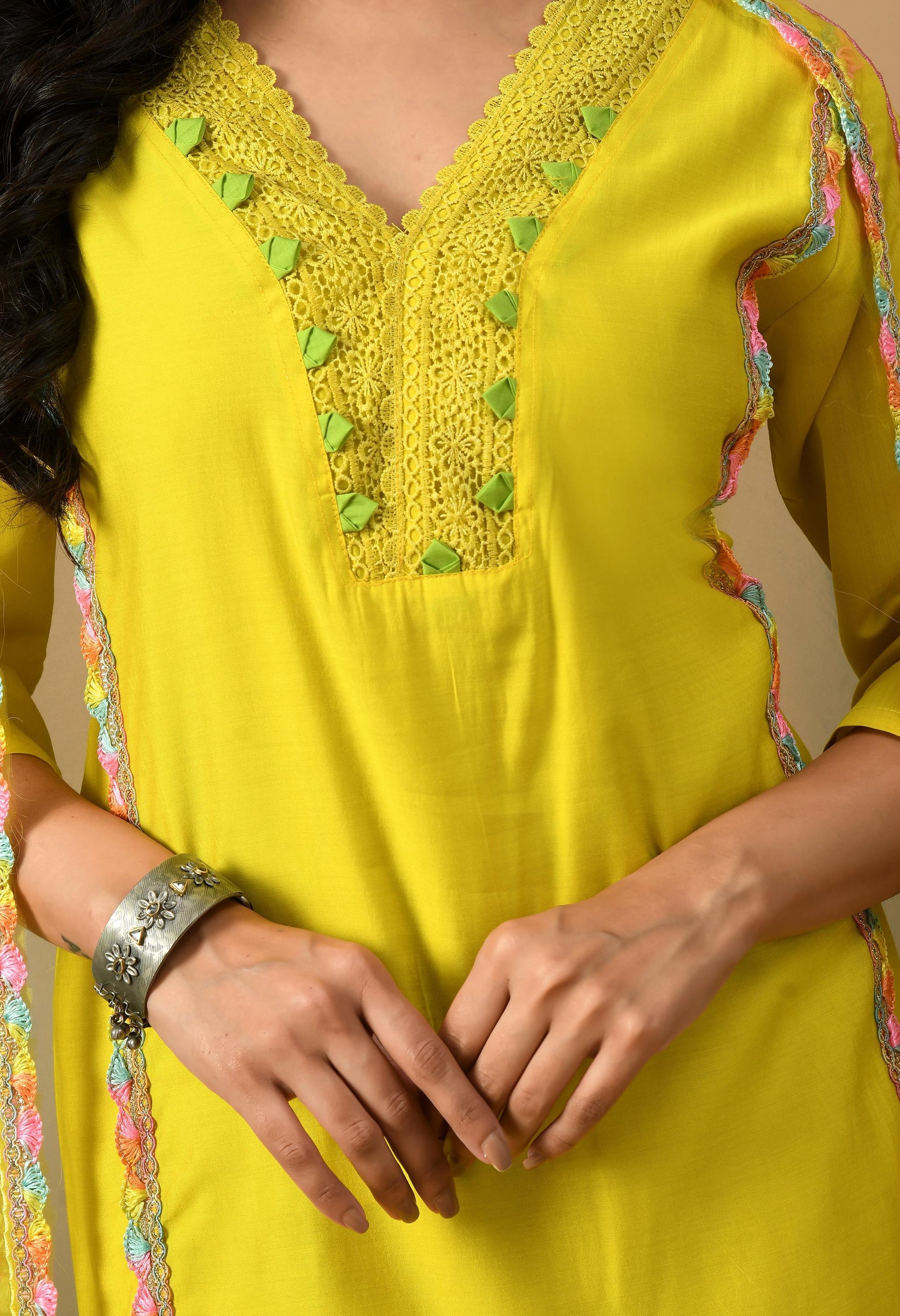 🌟 Yellow Kurta with Multi-Colour Lace Work Set 🌟